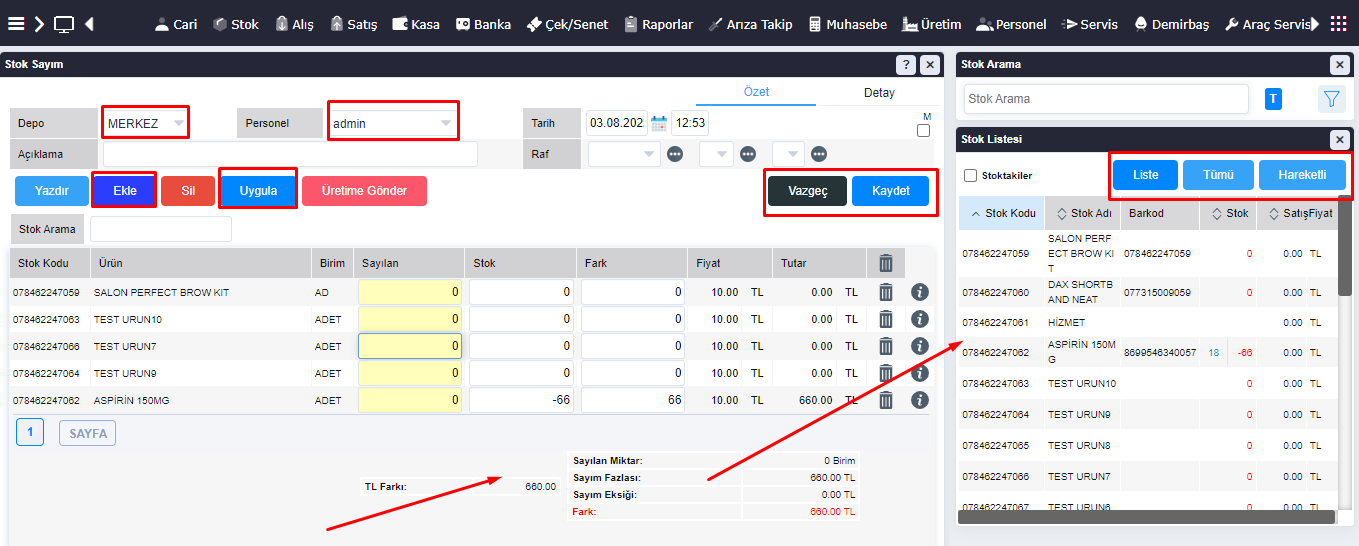 Webticari'de sayım yapmak için; Stok -> Sayım -> Yeni Sayım menüsü kullanılır. Sayım depo bazlı yapılmaktadır, öncelikle sayacağınız depoyu seçmeli ve ardından sağdaki listeden sayacağınız stokları listeye eklemelisiniz.